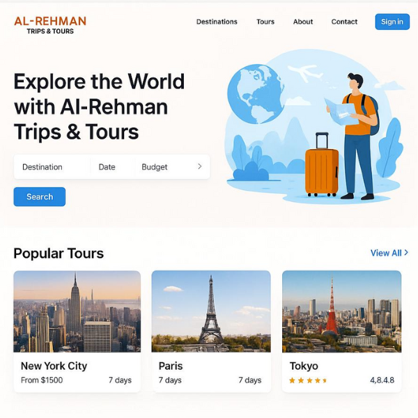 AlRehman Travel & Tour is a professionally crafted UI/UX design for a modern, web-based tourism and travel booking platform. The design focuses on user-centered experiences with intuitive navigation, visually appealing layouts, and clean, responsive components. Created using tools like Figma/Adobe XD (or your tool of choice), the layout includes sections for featured destinations, package listings, booking forms, and customer testimonials. With a focus on clarity, consistency, and mobile responsiveness, this design system provides a strong visual foundation for developers to implement a fully functional travel website in the future